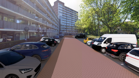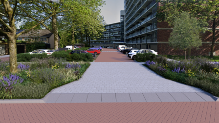 - We maken een nieuwe in- en uitrit naar de parkeerplaatsen bij de flats.